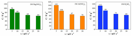 Figure 6 shows the dependence of the specific capacitance as a function of scan rate for all investigated electrolytes. The specific capacitance, calculated at 5 mV s−1, is found to be higher in Al(NO3)3 (141 F g−1) than in H2SO4 (112 F g−1) and Mg(NO3)2 (96 F g−1), while the calculated values at 20 mV s−1 amount to 87 F g−1 for Al(NO3)3, 73 F g−1 for H2SO4 and 68 F g−1 for Mg(NO3)2. As the scan rate increases, the specific capacitance decreases, and the best capacitance retention was obtained with the Mg(NO3)2 electrolyte (Figure S3). Capacitance retention (at 400 mV s−1 relative to 5 mV s−2, Figure S3) decreases in the order: Mg(NO3)2 > H2SO4 > Al(NO3)3.