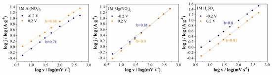 Figure 7 shows the linear plot of log(j) versus log(v), which is obtained at 0.2 and −0.2 V, respectively, for all three electrolytes. As can be seen from Figure 7, the b value is close to 1 for 1M H2SO4 and 1M Mg(NO3)2, which is characteristic of electrochemical supercapacitors, and the charge storage is non-diffusion limited (adsorption of ions and fast surface oxido-reduction reaction). In the case of the 1M Al(NO3)3 electrolyte, the b values obtained at two potentials lie between 0.5 and 0.8, which is characteristic of a supercapattery [37].