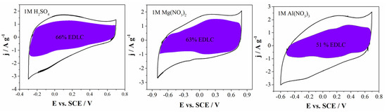 For further investigation, Dunn’s analysis was employed. The diffusion-controlled current and the capacitive current can be separated using Dunn’s analysis [43]. As can be seen from Figure 8, the electrical double-layer capacitance (EDLC) contribution is dominant for all electrolytes, ranging from 49% for Al(NO3)3, 63% for Mg(NO3)2 and 66% for H2SO4. The EDLC contribution roughly corresponds to the capacitance retention. In order to explain this energy-storage behavior, the size of the hydrated ions should be considered. The sizes of hydrated H3O+ and SO42− ions are 0.36–0.42 nm and 0.53 nm, respectively. Furthermore, the sizes of hydrated NO3−, Mg3+ and Al3+ ions are 0.68, 0.86 nm and 0.96 nm, respectively [28]. This similar EDLC contribution to the total capacitance could be explained with the size of hydrated electrolyte ions ranging from 0.36 to 0.96 nm. It is well known that the diameter of pores should be close to the size of hydrated ions for electrical double-layer formation. Additionally, the lowest EDLC contribution was obtained in the Al-based electrolyte, which could be attributed to the slightly larger size of the hydrated Al3+ ions compared with the median pore diameter of the investigated materials (0.95 nm) (Table 1). The mentioned size of the hydrated Al3+ ions leads to their impossibility to penetrate into small microspores (i.e., ultramicropores). For that reason, the mentioned lower EDLC was determined for the Al-based electrolyte. If we use Dunn’s analysis again (Figure 8), during the positive polarization of the electrode, the shaded area in the CVs (noted as EDLC contribution) is larger compared with the area during negative polarization. Therefore, during the positive polarization of electrode, the contribution of EDLC is higher; therefore, it can be concluded that electrolyte anions (SO42− and NO3−) are mostly involved in EDLC formation. Contrary, during negative polarization, the shaded areas in the CVs are lower and pseudocapacitance contribution is dominant, mostly arising from the Faradaic reaction between the surface functional groups of material and the cations of the electrolytes (H+, Mg2+ and Al3+). From these results, we acquire the impression that in the formation of EDLC, anions are mostly involved, while in pseudocapacitive reaction, cations are dominantly involved.