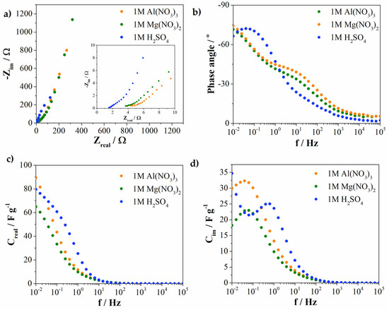 A complex capacitance analysis, namely the real (Creal) and imaginary parts (Cim) of capacitance, are shown in Figure 9c,d. The trend of the capacitance change in the low-frequency region (10−2 Hz) corresponds to the trend obtained by the cyclic voltammetry. As the frequency increases, the real capacitance value decreases as a consequence of the impossibility of ion penetration into pores at high-frequency values. The real capacitance value in the low-frequency region (from 0.1 Hz to 1 Hz) is higher when compared with multivalent-ion electrolytes in the same frequency region. This kind of behavior was expected since the EIS was performed at positive potential (0.2 V). At positive potential, negative ions penetrate into material pores. Since the hydrated radius of SO42− is lower compared with the nitrate anions, the ability to penetrate into smaller pores at higher frequencies is better. Therefore, the capacitance is higher in the mentioned frequency range compared with the electrolytes containing nitrate ions. The overlapping curves obtained for Mg(NO3)2 and Al(NO3)3 in this frequency region could support the mentioned assumption.