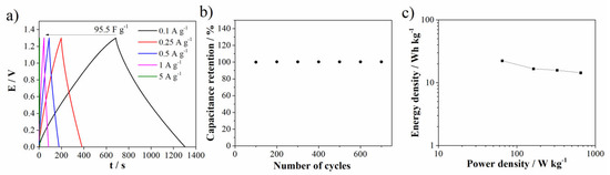 GCD (in two-electrode configuration) was performed in 1M Al(NO3)3 since the investigated electrode showed enhanced capacitance performances in an aluminum electrolyte. GCD was performed using different current densities (Figure 10a). As the current density increases, the specific capacitance decreases. At the same current density (0.1 A g−1), other carbon materials prepared by more complex synthesis procedures showed shorter discharge times (as well lower potential ranges than 1.3 V) compared with Carbw [52]. Figure 10b shows good capacitance retention after 700 cycles of charge/discharge.
