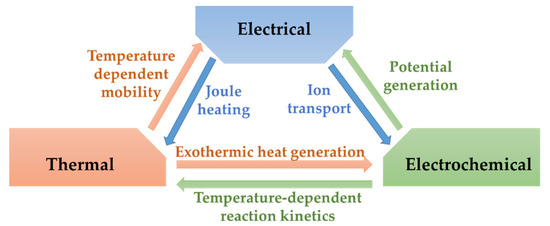 The different processes that take place inside the batteries are strongly connected one to another. The reactions generate heat which affects temperature uniformity inside the cell [10,11]. The temperature gradient consecutively dictates the electrochemical reaction kinetics, the transfer of ionic charge and the crystalline phase equilibria of the electrodes. The dynamics of these phenomena are heavily connected [12]. The interactions between thermal, electrical, and electrochemical phenomena are illustrated in Figure 1. The processes include species diffusion, charge transport, chemical kinetics and thermal transport and are directed by physical laws including several transport properties, such as thermal conductivity, mass diffusivity or reaction rates [12].