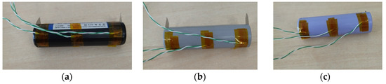 Three types of cylindrical Li-ion batteries from different manufacturers were used during the measurements, their parameters are listed in Table 1. Cylindrical Li-ion cells have a significantly higher energy density than prismatic or pouch cells [49]. Even though they cannot be packed as optimally as the other two cell shapes, cylindrical cells maintain a slight advantage even at a system (battery pack) level. Temperature measurements were made using K-type thermocouples with PTFE insulation and 0.2 mm twisted pair conductor fixed to the battery surface using thermal insulation tape. To capture possible differences in heat generation and therefore temperature at the battery terminals, three thermocouples were used for the tests, in the proximity of the cathode, in the proximity of the anode and at the middle of the battery, as shown in Figure 2. Nickel sheets were welded to the cell terminals using spot welding.