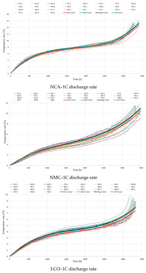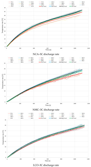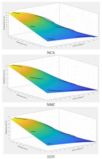 Based on the obtained results, it can be observed that the temperature rise for the analyzed NCA battery was by far the highest, while the magnitude of temperature rises for the analyzed LCO and NMC batteries were similar. Furthermore, through a more accurate analysis of the results, it can be stated that the NMC chemistry presents the best thermal behavior and offers the potential to be used in the future in lower-cost and higher-specific-energy batteries for electric vehicles.