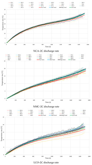 The hereby selected experimental data collections were then plotted on a single diagram for each battery type, resulting in a total of nine diagrams (3 battery types × 3 discharge rates). Each diagram illustrates a total of 27 curves, representing the measured temperature rise on all three locations on the battery surface. For every location, a 3rd-order polynomial equation was generated to describe the thermal behavior at the positive and negative terminal and in the middle of the cell, respectively. Additionally, another equation was generated to describe the trendline of all measured data.