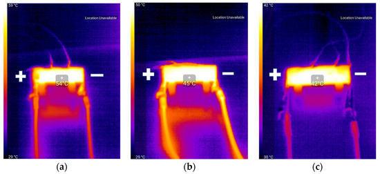 In Figure 5, pictures taken with the thermal camera at the end of the 2C discharge process are illustrated, which seem to be in agreement with the temperature rise values presented in Figure 4. One can also notice the different color shades of the wires in the presented three pictures, which can be due to the variable color scales present in the color bars, but mostly to differences in current values corresponding to the discharge rate for the presented battery capacities. The differences in wire temperature for the same C-rates also influenced the results presented in Figure 4 and the comparative analysis between battery chemistries.