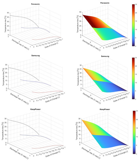 It is observed that no relevant temperature gradient was detected at the various thermocouple measuring locations on the batteries’ surface nor on the thermal camera images. Given the prior observation as well as the large number of data and generated coefficients, only the general trendline for all measured data will be considered in the following, with the aim of simplifying the results’ interpretation process. Even though only one dataset will be used in the following, indicating the global thermal behavior of batteries, measurements in several locations on the battery surface gave a more accurate calculation of the average temperature rise and offered the possibility to analyze thermal behavior also on a local level. Furthermore, if more relevant temperature differences arose at the different measuring locations, thermal maps and subsequently temperature predictions could be generated for multiple locations on the batteries. The obtained equations (presented in Table 2) were introduced in Matlab software and a thermal map was generated for each considered battery, as shown in Figure 6.