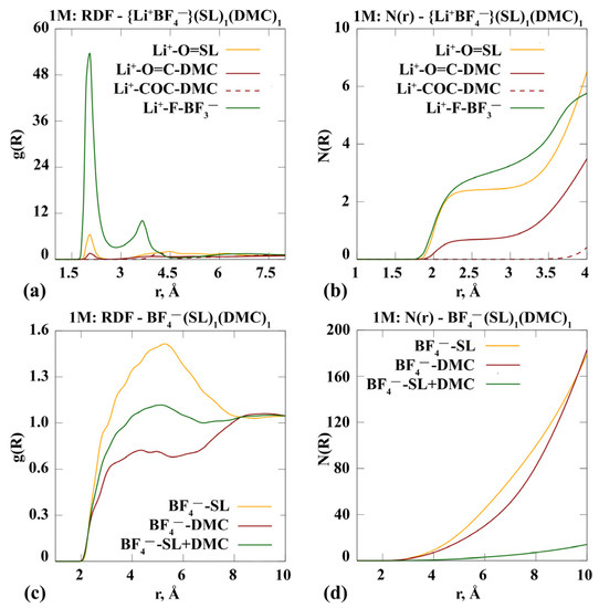 In the {Li+BF4−}(SL)1(DMC)1 system, the coordination of sulfolane with respect to the cation is more pronounced than in the case of the DMC environment. The DMC molecule, just like in a mixture of (EC)1(DMC)1, is coordinated with the cation via carbonyl oxygen. The total value of the coordination number of the cation tends to be six: the coordination of more than three molecules of the anion, two SL and not more than one DMC is likely (Figure 2a,b).