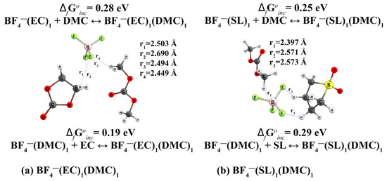 Geometric structures of anionic complexes BF4− with (EC)1, (DMC)1, (a) (SL)1 and (DMC)1 (b).