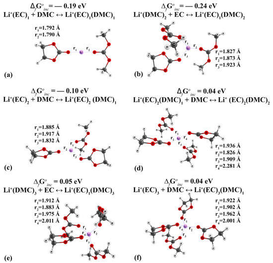 When the DMC and EC molecules are coordinated, the distance from the oxygen atoms to the cation is almost the same (Figure 4). When a mixed complex of Li+(EC)2(DMC)2 is formed, a structure with cross-symmetry of solvents is formed, with the lengths of the bonds differing slightly from each other (Figure 4d).