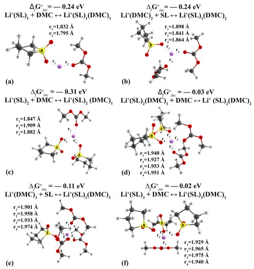 When SLs are coordinated, the distance from oxygen atoms to the cation exceeds that of DMC and EC molecules when comparing the coordination of a single solvent molecule. In the complex Li+(SL)1(DMC)1, the distance from the cation to the SL is 1.832 Å; with the addition of DMC molecules, this distance increases (Figure 5).