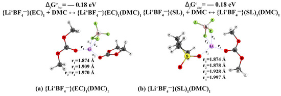 In the {Li+BF4−}(EC)1(DMC)1 complex (Figure 6a), the lithium cation is located closer to the DMC than to the anion or to the EC. The bond length between the oxygen DMC and the cation is 1.874 Å, while the bond length between the boron and Li+ is 1.970 Å and between oxygen EC and cation is 1.909 Å. In the case of {Li+BF4−} (SL)1(DMC)1 (Figure 6b), the cation is also closer to DMC than to SL, but this difference is very small. In other words, the coordination of solvent molecules in relation to the ionic pair is unchanged. The formation energy of −0.18 eV is the same for both these complexes.