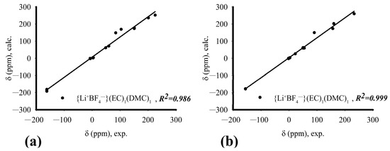 Dependence of experimental and calculated values of chemical shifts: (a) {Li+BF4−}(EC)1(DMC)1; (b) {Li+BF4−}(SL)1(DMC)1.