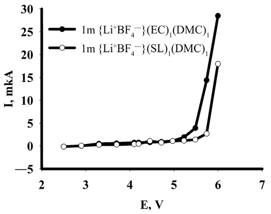 Ethylene carbonate (EC), which provides the formation of a stable solid electrolyte layer (SEI) on the surface of the carbon electrode, remains an indispensable component of commercial lithium-conductive electrolytes. EC, like with other components of the electrolyte solution, affects the properties of the cathode–electrolyte interface (CEI), which forms on the surface of cathodes. Under conditions of anodic polarisation of the positive electrode during the charge cycle, molecules of solvent and lithium salt ions undergo electrochemical oxidation at increased potentials. Insoluble products of these poorly studied processes are part of CEI, affecting the stability of cycling and cell performance. Alkyl carbonates still constitute the main components of the electrolyte solution due to their suitable physicochemical properties. Therefore, one of the possible strategies for increasing the electrochemical stability to ≥5 V by modifying the composition of the electrolyte involves the partial replacement of carbonate solvents with more electrochemically stable compounds (whose complete replacement creates problems with the formation of high-quality SEI) [13]. To replace carbonate solvents, several electrolytes have been proposed such as fluorinated [14,15,16], nitrile-based [17,18,19], ionic liquids [20] and sulfone-based [21,22,23] electrolytes. Among them, of particular interest are cheap and affordable sulfones representing a group of by-products of oil and chemical industries, whose most widely used member is sulfolane (SL) [23].