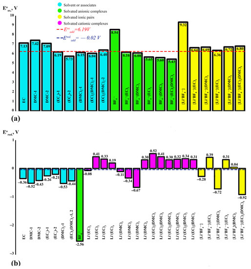 For the solvated ion pairs of the composition {Li+BF4−} (EC)1 and {Li+BF4−} (EC)2, calculated values on the acidity potential fall into the range of 6.60–8.74 V [48]. These neutral particles can undergo both electrochemical oxidation and electrochemical reduction. However, no work has been found in the literature on RP calculations.