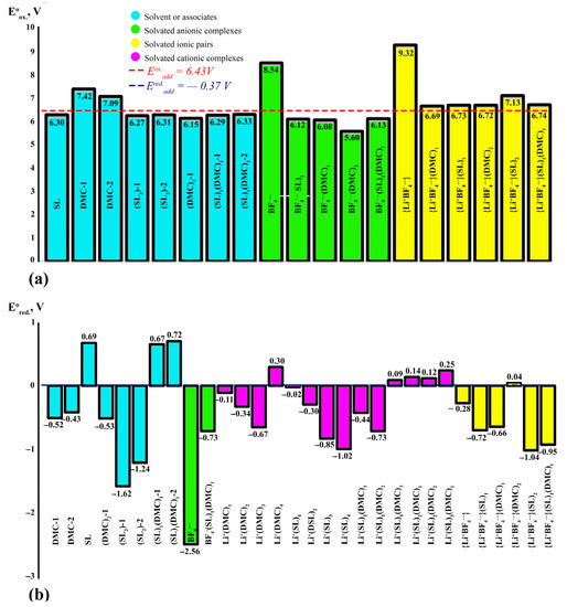Thus, the [30,57,58,59] solvent molecules ( EC, SL, DMC) and their complexes fall into a range from 5.73 V to 7.42 V, while the experimental data for electrolyte solutions, which appear in a range from 5.3 to 6.7 V [48,57,58], depend on the nature and concentration of the salt, as well as the material of the working electrode. The range of experimental values depends on the type and concentration of salt. Here, the variation in the calculated OP values is obviously related to the calculation and solvent accounting methods. The values of [48] closest to the experimental data are those calculated using composite methods, for example, G4MP2 [59]. Calculations in the approximation of the gas phase or in a solvent medium with a low dielectric constant give inflated values of OP [48,60,61].