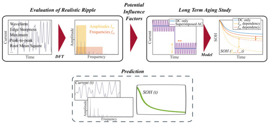 Any signal—here, the ripple current—can be reconstructed from the superposition of several sinusoidal oscillations with defined frequencies and amplitudes. The Discrete Fourier Transformation (DFT) is being used to determine the frequency spectrum. Assuming that the effects of the individual frequency components on the cell are additive and time-invariant, it is sufficient to investigate the influence of pure sinusoidal oscillations with amplitudes and frequencies represented in the ripple spectrum (hereinafter referred to as sinusoidal tests). Thus, the possible influencing factors to be varied within the aging study are reduced to amplitude and frequency. Checkups are carried out during the aging study at certain intervals to determine the SoH of the examined cells non-invasively. If the influence of amplitude and frequency on the cell and the SoH is known and the assumptions made are correct, the lifetime can be predicted for any ripple current composed of the frequency components within the ranges of values investigated. Figure 5 shows schematically the approach chosen to reduce the experimental effort.