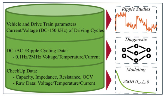The practical application of the methods developed in this work resulted in the SiCWell dataset, which is helpful for various applications in battery research. The cycling data of the battery are well suited for developing and validating state-of-health diagnosis methods in a realistic environment. The realistic ripple tests of the dataset contain the current profiles of two driving cycles applied to multiple battery cells. This results in a benchmark for a broad range of battery diagnosis methods. Furthermore, the raw and metadata of the dataset can be used to derive aging models for the influence of AC currents. Aging models that describe the influence of the ripple current on the battery’s lifetime offer the possibility of deriving optimizations of the hardware and software of the high-voltage DC bus concerning the ripple current based on simulations. For example, the large and expensive DC link capacitor, can be scaled down to fit the aging target of the battery. Another example is the switching frequency of the inverter, which can be chosen corresponding to the ripple currents the battery is less sensitive to.