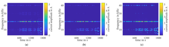 Frequency components of the ripple current over the driving cycle obtained by simulation (a,b) and measurement at the battery tester (c). (a) Simulated sWLTC; (b) compressed sWLTC; (c) measured sWLTC at battery tester.