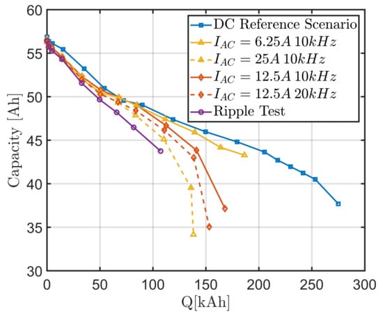 Figure 11 shows the capacity curve measured for a test series of sinusoidal/ripple tests and DC reference scenario (mean value per test series). The Figure shows that the superimposed AC components have a negative influence, which leads to a significant reduction in the available capacity. If 45 A h is defined as the end of life (EoL) of the cells (approx. 80% of the initially measured capacity), the results shown in Figure 11 indicate a significant reduction in the lifetime of the cells when AC or ripple currents are superimposed. Depending on the superimposed sinusoidal or ripple current, the ampere-hour throughput until the EoL of the cells was reached reduced between 13 up to 45% (45% for ripples containing realistic frequency components for specific operating points—see Section 3.2.3). Thus, the shown results support the thesis that realistic ripples caused by the switching processes of semiconductors contribute to an additional and non-negligible aging of the cells in an EV. Therefore, according to the results of this study, the influence of ripple currents should be taken into account in the design of the high-voltage DC bus. In turn, this also requires corresponding models about the influence.
