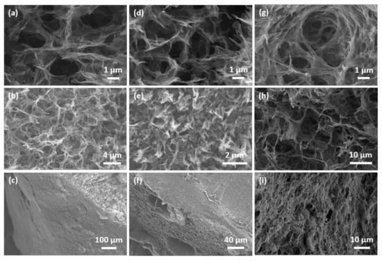 SEM images of the reduced graphene oxide aerogel and of the ethylene diamine and α-cyclodextrin modified aerogels at different areas and several magnifications (a–c) rGO, (d–f) rGO-CD, and (g–i) rGO-EDA aerogels. The areas of the aerogels that were used for the SEM imaging are (a,d,g) top view, (b,e,h) side view, and (c,f,i) cross-sectional view.