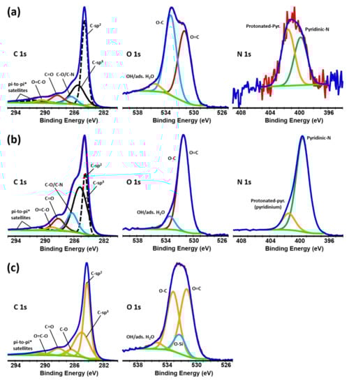 C 1s, O 1s, and N 1s core level spectra and individual peak fitting for the (a) rGO, (b) rGO-EDA, and (c) rGO-CD aerogels.