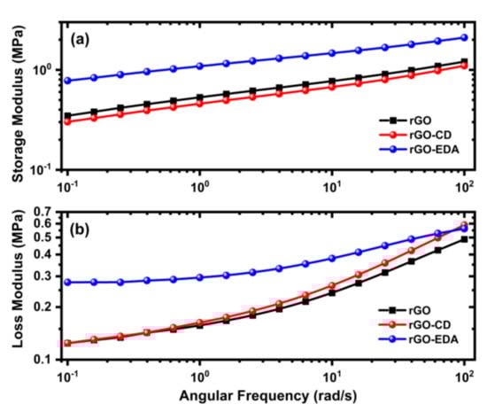 Rheological properties of the synthesized rGO and rGO functionalized aerogels. (a) The storage and (b) loss modulus were measured from oscillatory frequency sweeps.