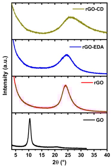 The XRD patterns of the rGO-based aerogels are shown in Figure 4. For comparison, the diffraction pattern of the unmodified GO that was used in the hydrothermal reaction is also presented. The 2θ value of the diffraction peak for the GO is positioned at of 10.4° and corresponds to an interlayer spacing (dsp) of 0.85 nm, where dsp = λ/2sin θ with λ being the wavelength of X-ray beam. The X-ray beam wavelength was λ = 1.5418 Å, Cu Kα radiation. The typical interlayer spacing of the natural graphite for the (002) diffraction peak is approximately 0.34 nm (2θ = 26.4°) [35,55]. The higher interlayer spacing of the GO is attributed to the repulsive forces between the basal planes due the presence of oxygen groups. The aerogels do not exhibit the characteristic diffraction peak for the GO. The 2θ values for the diffraction peaks of the aerogels are positioned at higher values compared to the GO diffraction peak. The shifting towards higher 2θ values can be attributed to the hydrothermally induced oxygen reduction and the resulting decrease of the interlayer spacing. The latter is 0.37 nm (2θ = 24.1°) for the rGO aerogel, which is in good agreement with values reported in literature for hydrothermally reduced graphene oxide [35,55]. The interlayer spacings of the rGO-EDA and rGO-CD aerogels are 0.36 nm (2θ = 24.5°) and 0.34 nm (2θ = 26.2°), respectively. These values approach the 2θ value of the natural graphite however, the diffraction peaks are very broad compared to the very narrow diffraction peak of the natural graphite (FWHM approximately 0.2 degrees [56]) as well as to the diffraction peak of the GO. The broadening of the diffraction peaks indicates a disordered stacking of the assembled rGO layers [35,55]. This structural disorder is more evident in the surface modified aerogels and especially in the rGO-CD that is characterized by an asymmetrical broadening of the diffraction peak. This behavior can be associated with the intricate ring-type structure of the cyclodextrin molecules that resulted in a more anisotropic assembly mechanism. The introduced functionalities prevent the ordered assembly of the reduced oxide layers and introduce structural heterogeneities that can provide additional adsorption sites for the sodium ions. The XRD results are in good agreement with the BET measurement results (Figure S3 in the Supplementary Materials). The half pore width and the pore volume distributions show a clear shift towards higher values for the rGO-CD aerogel in the 30 to 80 Å range.