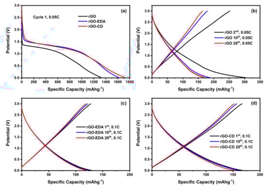 Charge and discharge profiles of the rGO and rGO modified aerogels. (a) Formation of the SEI during the 1st discharge cycle. Voltage profiles at several cycling rates (b) rGO at 0.05 C, (c) rGO-EDA at 0.1 C, (d) rGO-CD at 0.1 C rate.
