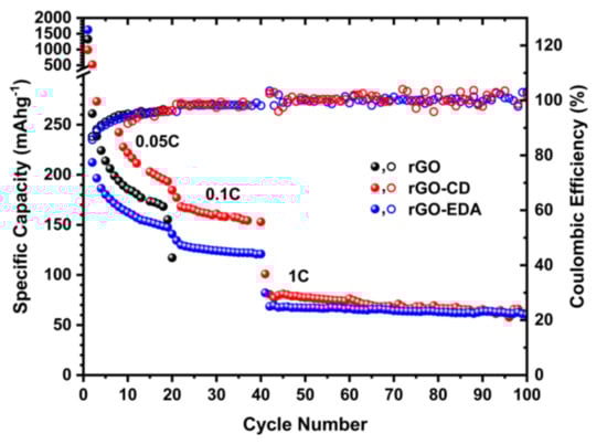 Characteristic charge and discharge voltage profiles of the assembled cells are shown in Figure 6. The high-capacity values during the first cycles are associated with the formation of the solid electrolyte interphase (SEI) and such high values are typical for porous electrode structures with large surface area [43,44]. The SEI formation is also shown in the cyclic voltammetry (CV) measurements in Figure S8 (Supplementary Materials). The SEI for the rGO-EDA and rGO-CD is formed at higher potential values compared to the pristine rGO. This is in good agreement with the charge and discharge voltage profiles in Figure 6a. The electrolyte reduction (decomposition) in the CV measurements of the rGO is present in all measured (10) cycles indicating a less stable SEI compared to the SEI in the modified aerogels. The electrolyte reduction in the modified aerogels is present only in the first cycle. The rate performance of the aerogels is summarized in Figure 7. The cycling stability of the pristine unmodified rGO aerogel was poor. The cells failed after 20 cycles at 0.05 C. This behavior can be attributed to the electrolyte decomposition [58] that is evident in the CV testing results in Figure S8. The cyclability of the surface modified aerogels was significantly improved. The rGO-CD exhibited the highest capacity values at 0.05 and 0.1 C rates. This can be related to the more disordered structure of the assembled rGO layers (the asymmetric broadening of the XRD pattern for the rGO-CD indicates a broad distribution in the interlayer spacing) as well as to the higher oxygen content of the CD functionality. The amine modified rGO-EDA aerogel, although it demonstrated lower capacity values at 0.05 and 0.1 C rates, its cycling performance was more stable and the trend in the capacity and Coulombic efficiency values was consistent with less scattering over the measured cycles. The introduced structural heterogeneities enhanced the rate performance with the more anisotropic assembled structure resulting in higher capacity values. Interestingly, at the highest measured rate (1 C) the capacity values of the two surface modified aerogels coincide. This behavior can be attributed to the slow diffusion mechanism of the Na+ ions. At low charge and discharge rates there is sufficient time for the Na+ ions to occupy more sites resulting in a better sodiation and desodiation of the available sites in the cathode. At a higher rate, not all available sites for the adsorption of the Na+ ions can be utilized, and the rate performance of the surface modified aerogels is similar.