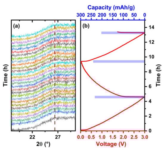 XRD patterns obtained during the charge and discharge of the cell. (a) Operando XRD patterns of the rGO-CD aerogel. The broken line indicates the broad peak at 2θ = 26°. (b) The corresponding discharge and charge profile at 0.1 C rate. The capacity values are shown in the bar plot.