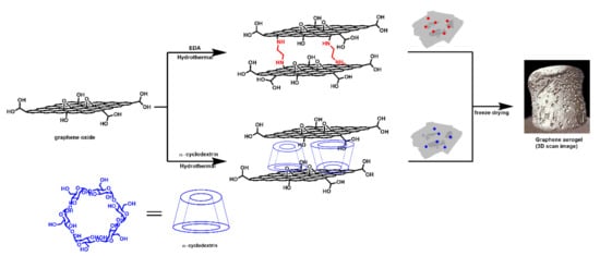 Graphical illustration of the ethylene diamine and α-cyclodextrin modified aerogels. The hydrothermal method was used for the synthesis of the aerogels. The 3D scan image of the aerogel was obtained using X-ray tomography measurements.