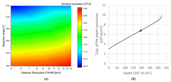 (a) Near-surface depth resolution in [TFU = 1019 at/m2] vs. detector resolution and angle for normal beam incidence of the 7Li(p,α0)4He reaction. The impact of resolution is minor compared to the angle. (b) Resolnra calculation of the depth resolution in the Si-doped anodes showing the increase of depth resolution with depth in our given setup of 15 keV energy resolution and 150° reaction angle. The depth resolution roughly triples up to the analysis range of 3 × 1024 at./m2 equal to ~30 µm with a linear increase.