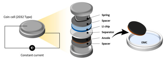 The anode slurry contains 20 wt.% of silicon-oxide SiOx (AS2D, ShanShan Tech, Shanghai, China); 70 wt.% of graphite (SMG-A5, Hitachi, Japan); 2 wt.% of carbon black (C65, Imerys, France); and 8 wt.% of binders composed of carboxymethyl cellulose (CMC 2000PA, DOW Chemical, Midland, USA), styrene-butadiene rubber (SBR) (BM-451B, Zeon Europe GmbH, Düsseldorf, Germany), and lithium substituted polyacrylic acid (LiPAA). Graphite and SiOx have similar densities of 2.24 and 2.26 g/cm3, but different particle sizes of 11–23 and 5–7 µm, respectively. The slurry is then coated on a copper foil (10 μm thickness), dried at 60 °C, and subsequently calendered. The density of the produced anode is 1.375 g/cm3 or 0.164 µm/(1022 at./m2). The anode is punched to 14 mm diameter using a high-precision electrode cutter (EL-CELL) and then dried for longer than 10 h at 80 °C in a glass oven B-585 Drying (Buchi). The dried anode is transferred to an argon-filled glove box to be assembled with a lithium foil (PI-KEM, Wilnecote, UK) in a coin cell set-up (2032-type). A glass microfiber filter (GF/C, Whatman, UK) is used as a separator and 1.0 M LiPF6 in ethylene carbonate (EC): ethyl methyl carbonate (EMC) (3:7, w/w) (E-Lyte Innovations GmbH, Münster, Germany) mixed with 10 wt.% of fluoroethylene carbonate (FEC) (E-Lyte, Germany) as an electrolyte. Figure 2 demonstrates the cell assembly.