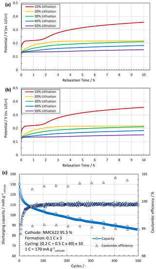 The assembled coin cells are lithiated with a galvanostatic mode at 0.2 C-rate until the lithiation capacity of the cells reaches the designed degrees as shown in Figure 3a. Table 2 describes the lithiation parameters for the different SoCs. However, prior to this process, the full capacity of the anode is measured with a cut-off potential of 0.01 V vs. Li/Li+ to 622 mAh/g, which is defined as the 100% SoC in this study. This value agrees to a calculation using 340 mAh/g for C and 1700 mAh/g for SiOx together with the deposited masses. The open circuit voltage (OCV) of each cell is monitored for 10 h after lithiation to check the potential recovery, as shown in Figure 3b, which may reflect lithium migration inside the structure. When the increasing trend of OCV subsides, the cells are carefully disassembled to take the lithiated anodes out. The anodes are rinsed with EMC for 5 min and dried under vacuum at room temperature.