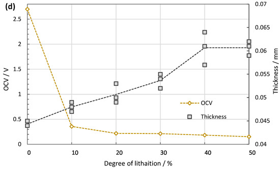 (a) Discharging profile during lithiation. The process time is controlled according to the pre-defined capacity to be stored in each cell. (b) Potential recovery measured for 10 h right after the lithiation process. The OCVs increase at first, but gradually reach a plateau. After this relaxation period, the OCV of the cell is inversely proportional to the degree of lithiation. (c) The cyclic behaviour of the made cells shows high Coulombic efficiency and capacity retention. (d) With increasing SoC, the thickness of the anode grows from ~44 µm at 0% to ~60 µm at 50% SoC.