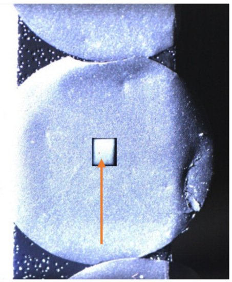 Exemplary camera image of the 14 mm circular sample with analysis-spot scintillation-light intensity overlay in the centre, indicating the 2 mm analysis spot size. After IBA, no visible changes of the sample occurred.