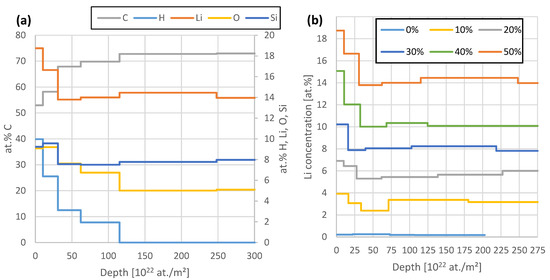 Figure 6 demonstrates the depth profiles obtained from this fit of the 50% SoC sample (a) and the comparison of the Li concentration between all six samples (b). The sample thickness is evaluated by assuming a stack of six layers with increasing thickness towards the sample backside. We see 7.7 at.% of Si, 7.6% O, 14% Li, and the remaining 70.7% C in this sample. With the lower Li content in the other samples, the other elements increase their share with constant ratios within uncertainties. The 0% SoC sample features 8.6 at.% Si, 8.6% O, 0.2% Li, and the remaining 82.6% C. The detection of H is not directly possible with the applied method, but it can be detected indirectly as a missing element for a consistent sample composition. Since RBS, NRA, and PIXE can actively detect practically all other elements such as N, C, O, or Si, it is highly probable that the missing aspect can be accounted to H. Nevertheless, this indirect nature significantly increases the uncertainty of H concentrations shown in Figure 6, in comparison to the other elements. The measurements show a few % H in the samples with most of it sitting near the surface in the reaction layer.