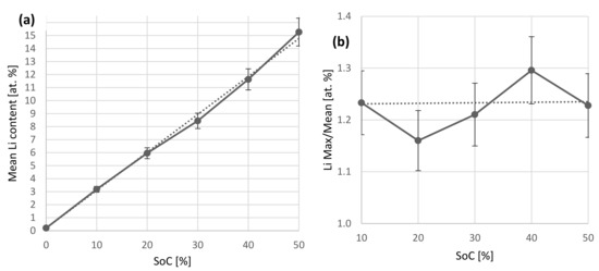 In all cases, except for the 10% case, the Li concentration remains mostly constant, besides a thin surface reaction layer. The 10% case shows a slight dip in the Li concentration of 2 at.% starting after the surface reaction layer, with ~3.2% in the remaining regions. It remains unclear whether the increased Li concentration close to the surface relates to the intercalation process, since the Li infiltrates the anode from this side and a maximum concentration could be expected here, or if it relates to the air exposure, since also H and O are higher in this region, or the formation of a solid-electrolyte interface (SEI). Figure 7 compares the Li concentration average excluding the first 40 × 1022 at./m2 and the ratio of maximum Li concentration to this average. Table 2 compares the injected amount of Li derived from the charged capacity and the total amount of Li found by IBA. Interestingly, we find a mostly constant ratio of maximum to mean Li concentration of 1.23. The Li depth profile of the 0% SoC sample is constant within the somewhat larger uncertainties with no pronounced surface peak/maximum. Equation (1) depicts the resulting linear fit of Figure 7a with R2 > 0.999.