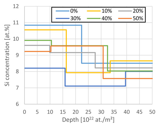 The Si depth profiles are shown in Figure 8. Similar profiles are obtained for O. The results indicate a 20% enrichment of SiOx at the surface (up to 30 × 1022 at./m2 depth), although the results somewhat scatter due to inaccuracies in the data fitting in this region and the mass resolution of the given RBS setup cannot distinguish between Si and Al enrichment. The O concentration is also higher near the separator side.