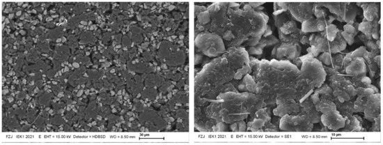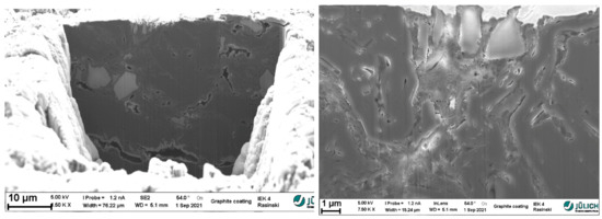Five kilovolt SEM pictures of a 33.5-µm-deep FIB cut in the separator side surface of the 50% SoC sample. SiOx particles with sizes between 1–3 µm and substantial porosity are visible, but there is no clear indication of thicker SEIs. An EDX scan through the four brighter particles on top of the right figure confirms them to be SiOx particles.