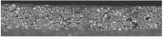Fifteen kilovolt backscattered electron SEM image of a cross-cut of the 40% SoC anode with the separator side on top. The light grey particles are SiOx and the dark grey C. The investigated anode region is 400 × 55 µm2.