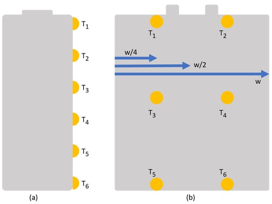 Temperatures were measured using T-type thermocouples and associated PicoLogger with 8 channels connected to a laptop. Cell 1 from the layout in Figure 2 had 6 thermocouples fixed to it using thermal epoxy in the layout shown in Figure 3, while the other had one applied to the centre of the battery. A final thermocouple was used to monitor the environmental temperature. Tests were started at −18 °C and ended when the maximum cell temperature reached 0 °C, or when thermal equilibrium was reached. The largest pouch cell was allowed to continue slightly beyond 0 °C in order to reach thermal equilibrium and thus allow better comparison of the effect of size.