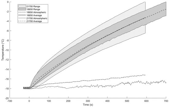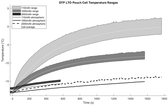 The overview of the results for the cylindrical cells is shown in Figure 4, and for the pouch cells in Figure 5. The tests on the two smaller pouch cells (110 and 1000 mAh) were terminated before they reached 0 °C because they reached thermal equilibrium at average cell temperatures of 0.84 and 6.7 °C over ambient temperature (which could not be precisely controlled), respectively (Figure 5), and would not heat further at this current.