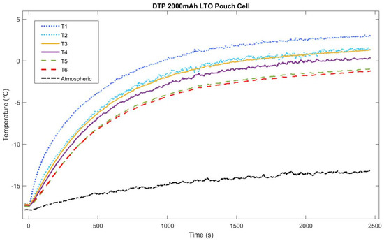 Temperature evolution of the 2000 mAh pouch cell during the test. Temperatures T1–T6 correspond to the locations shown in Figure 3.