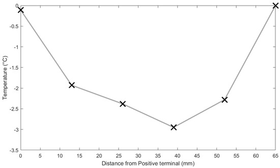 At the end of the test, the temperature profile along the axial direction of the 18650 cell is U shaped, with the highest temperatures recorded on the ends and the lowest in the middle (Figure 8). This is likely due to the higher thermal conductivity of cylindrical cells in the axial rather than the radial direction [20], meaning that the ends reflect more closely the cell internal temperature, combined with the additional heating generated by the terminal connections (both internally and externally) at each end.