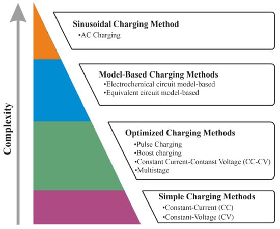Many charging methods have been reported in the literature, with various objectives, e.g., improving charging performance, charging time, energy loss, temperature rise, aging and lifespan. As seen in Figure 1, these methods can be roughly classified into the following four main groups with different levels of complexity: simple charging methods, optimized charging methods, model-based charging methods, and AC charging methods.