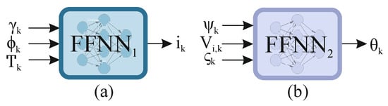 Although criticized as “black boxes” (making it harder to understand the possible correlations), FFNNs have proven to be a powerful tool and can approximate any continuous function, as established by the Universal Approximation Theorem []. Therefore, FFNNs can determine the charging current () and the cell balancing orders (θk) in real-time. To perform an efficient and optimized control of the battery charging process, the proposed algorithm combines two FFNNs. The first FFNN (Figure 2a) is responsible for the determination of the charging current (). This FFNN uses the following three inputs to accurately determine the charging current: the difference between the full charge voltage () and the average cell voltage of the pack (), which is represented by ; the maximum difference between cell voltages (); the pack temperature (), where is the instant of time. The second FFNN (Figure 2b) estimates the balancing orders (θk) using the following three inputs: the average cell voltage of the pack (), the voltage of each individual cell (), and the standard deviation of the pack voltage ().