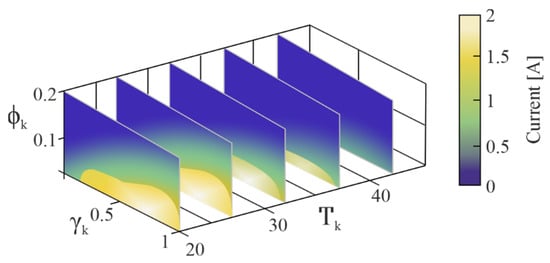 As seen in Figure 3, the parameter has a preponderant influence on the determination of the charging current, i.e., as the average cell voltage of the pack reaches the full charge voltage, the charging current must be reduced to protect the battery pack from overcharging and overheating. However, one must also consider the maximum difference between cells voltages. When the average cell voltage of the pack is far from the full charge voltage (4.2 V), the charging current only suffers a small decrease. As the average cell voltage of the pack gradually approaches the full charge voltage, the current is reduced to eliminate the imbalance between cells. Furthermore, the established guidelines prioritize the more effective top balancing. Another important aspect that can greatly affect battery pack lifespan is the operating temperature. Thus, to ensure a safe operation, the influence of temperature on the charging current is gradually increased, i.e., as the temperature rises the charging current is gradually reduced. However, if the pack operating temperature reaches 45 °C, the charging process is interrupted [].