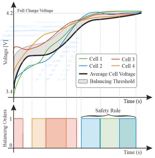 As can be seen in Figure 4, as the average cell voltage of the pack approaches the full charge voltage , the voltage balancing threshold gradually becomes more stringent (by reducing coefficient ), making the balancing process more demanding at the end of charging. This procedure allows a more effective balancing process at the end of the charging process (top balancing), when the charging current is lower and the balancing current is higher. Additionally, a safety rule was implemented, i.e., if any cell reaches the full charge voltage and the stopping criteria was not fulfilled, the cell is considered balanced.